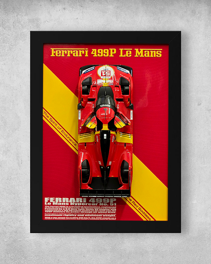Hochwertiges Myraceart-Porträt des Ferrari 499P im Massstab 1:24, präsentiert in einem eleganten 23×32 cm Rahmen. Detailreicher Fine-Art-Druck - perfekt für Motorsport-Fans und Ferrari-Enthusiasten.