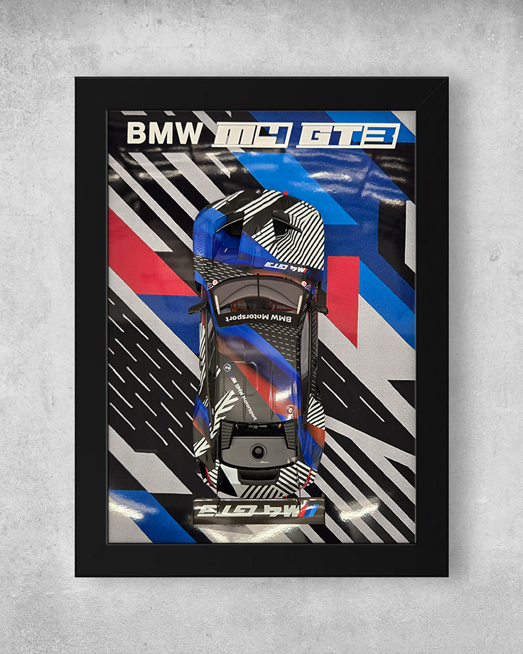 Ein Statement purer Dynamik: Das detailverliebte Modell des BMW M4 GT3 Concept #01 im Massstab 1:18 bringt die Faszination der Rennstrecke direkt ins Wohnzimmer. Rahmengrösse 30x40cm.